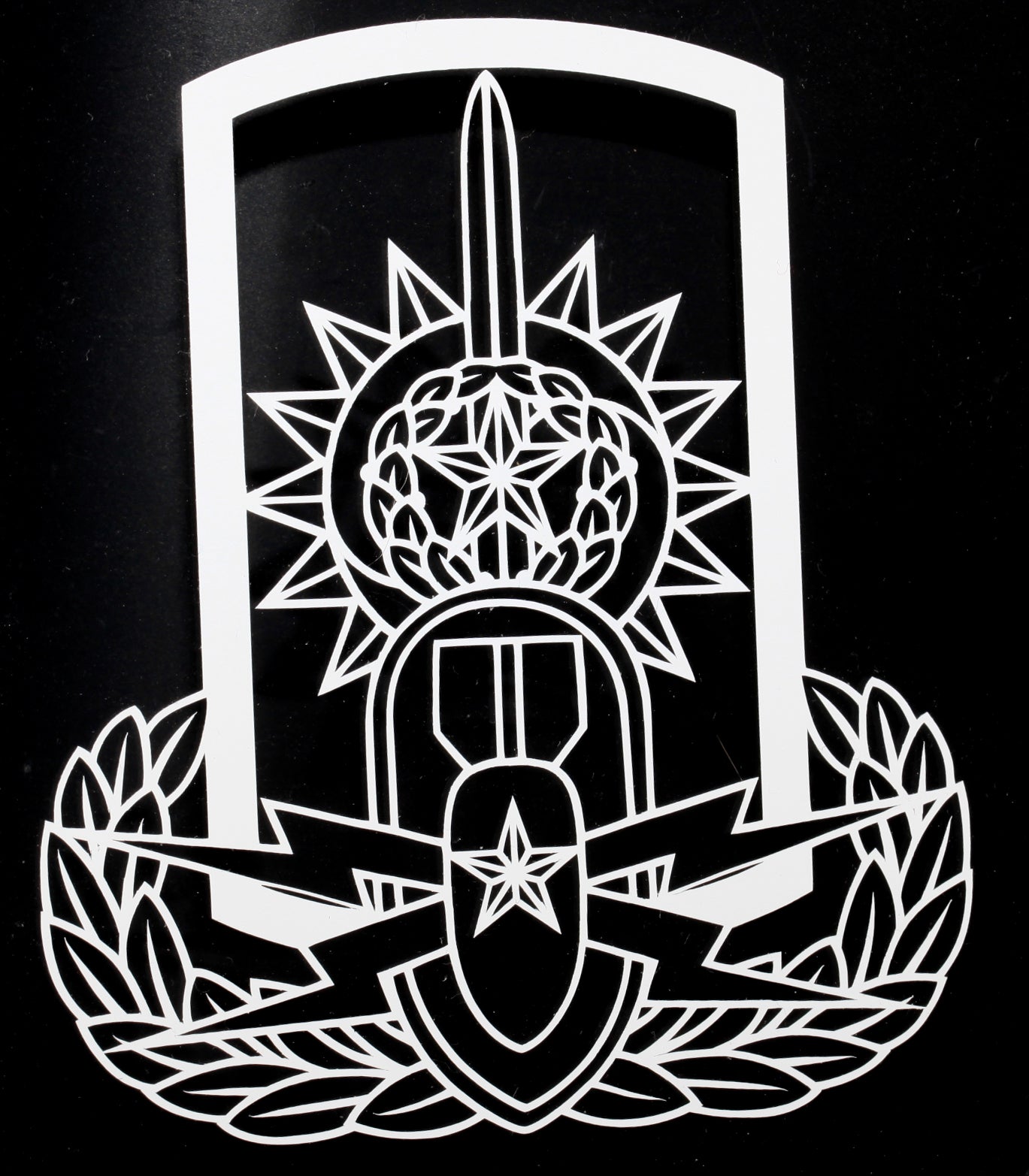 The 8th Military Police Bde patch for the 303rd EOD BN 74th 706th EOD with EOD badgein cutout vinyl. Intended for vehicle windows but can be used on any smooth surface. White and lighter colors show better on back vehicle windows.