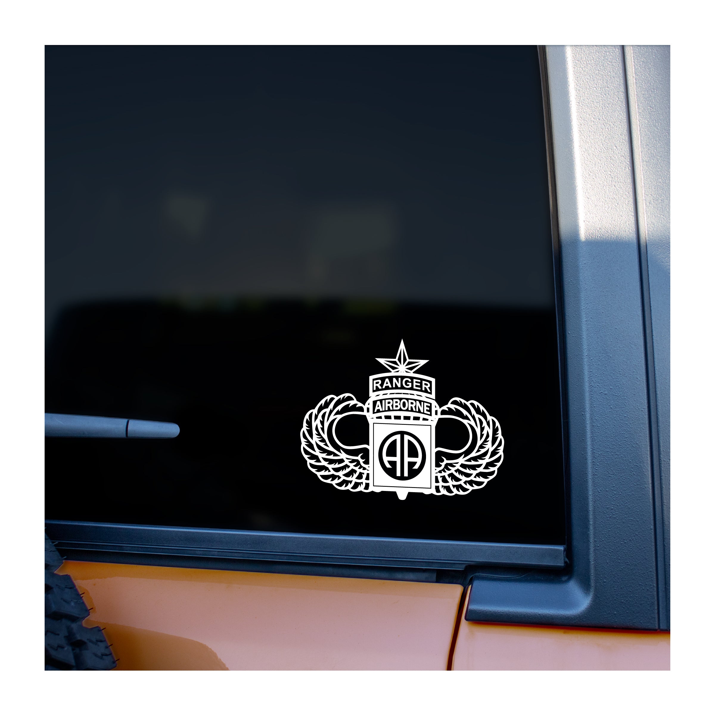 The82ndAirborne patch and Ranger tab with Master Airbornein cutout vinyl. Intended for vehicle windows but can be used on any smooth surface. White and lighter colors show better on back vehicle windows.