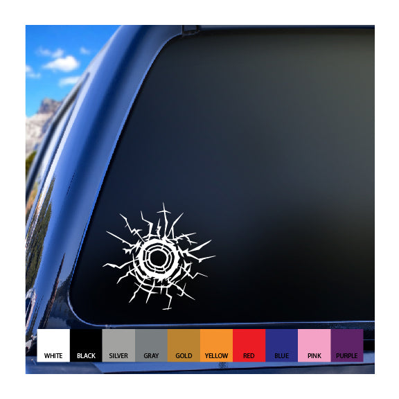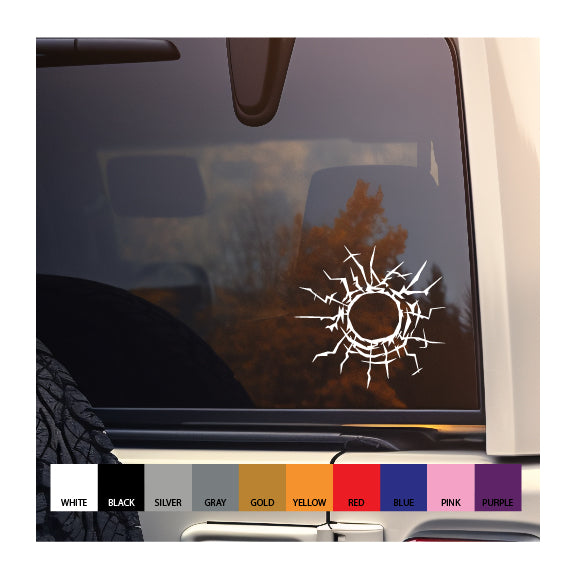 Bullet Hole decal. Intended for vehicle windows but can be used on any smooth surface. White and lighter colors show better on back vehicle windows.