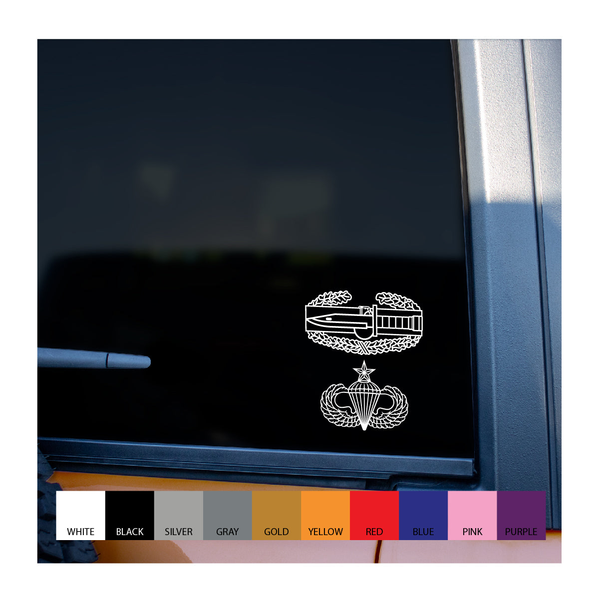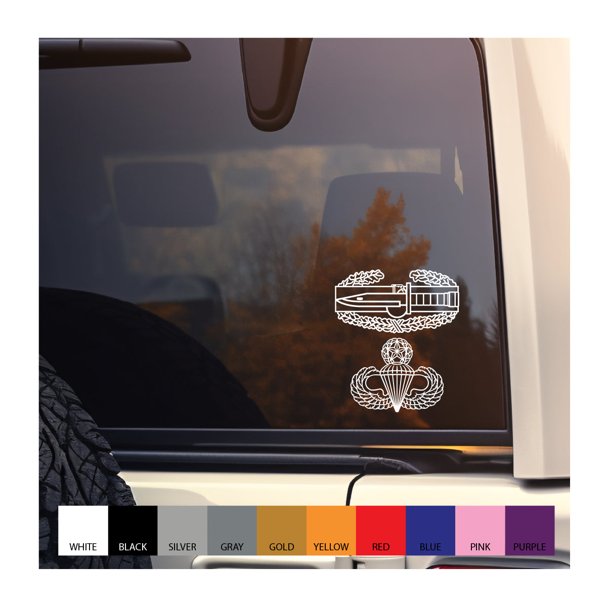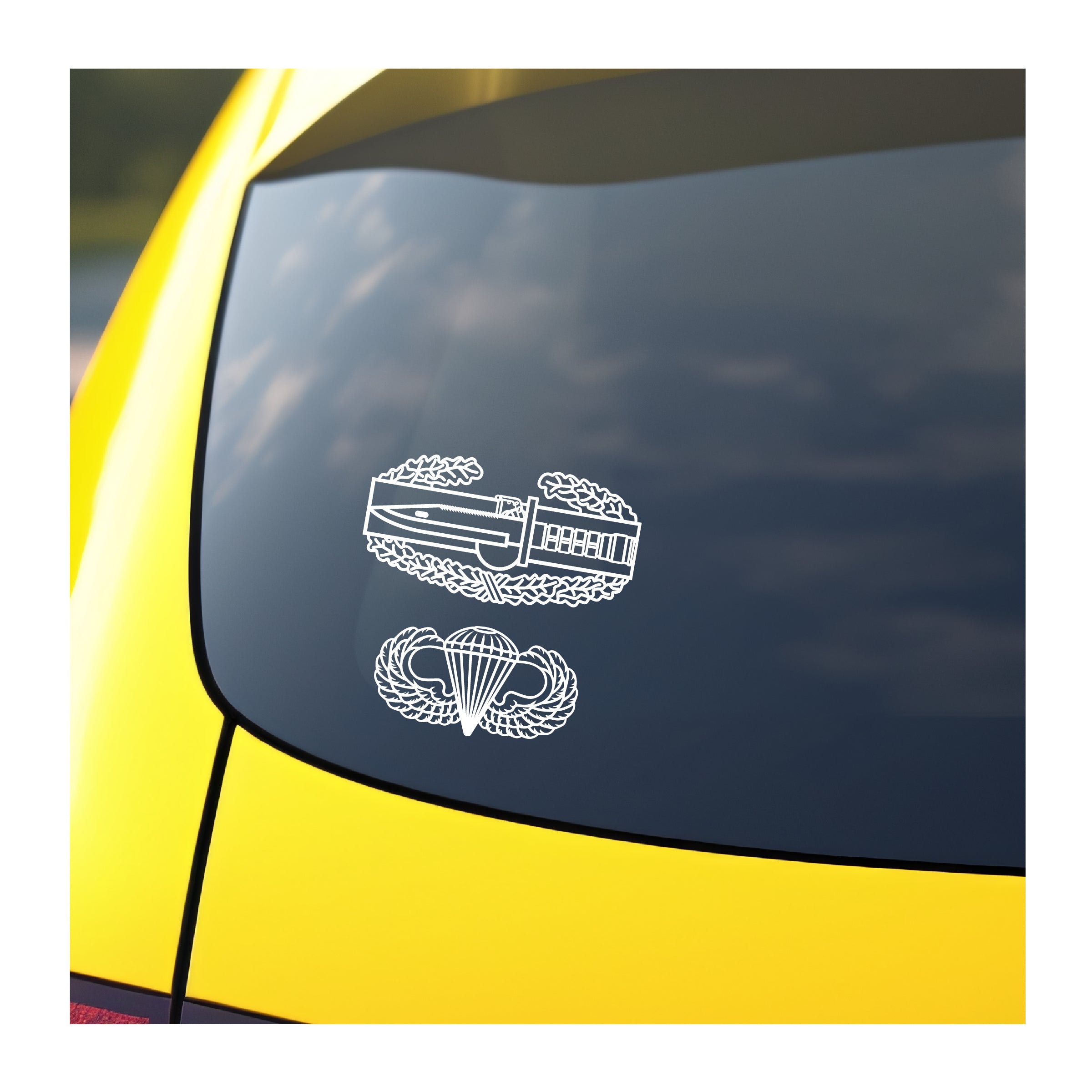 TheCombat Action Badge CAB Airborne and/or Air Assaultin cutout vinyl. Can be used on any smooth surface. White and lighter colors show best on back vehicle windows.