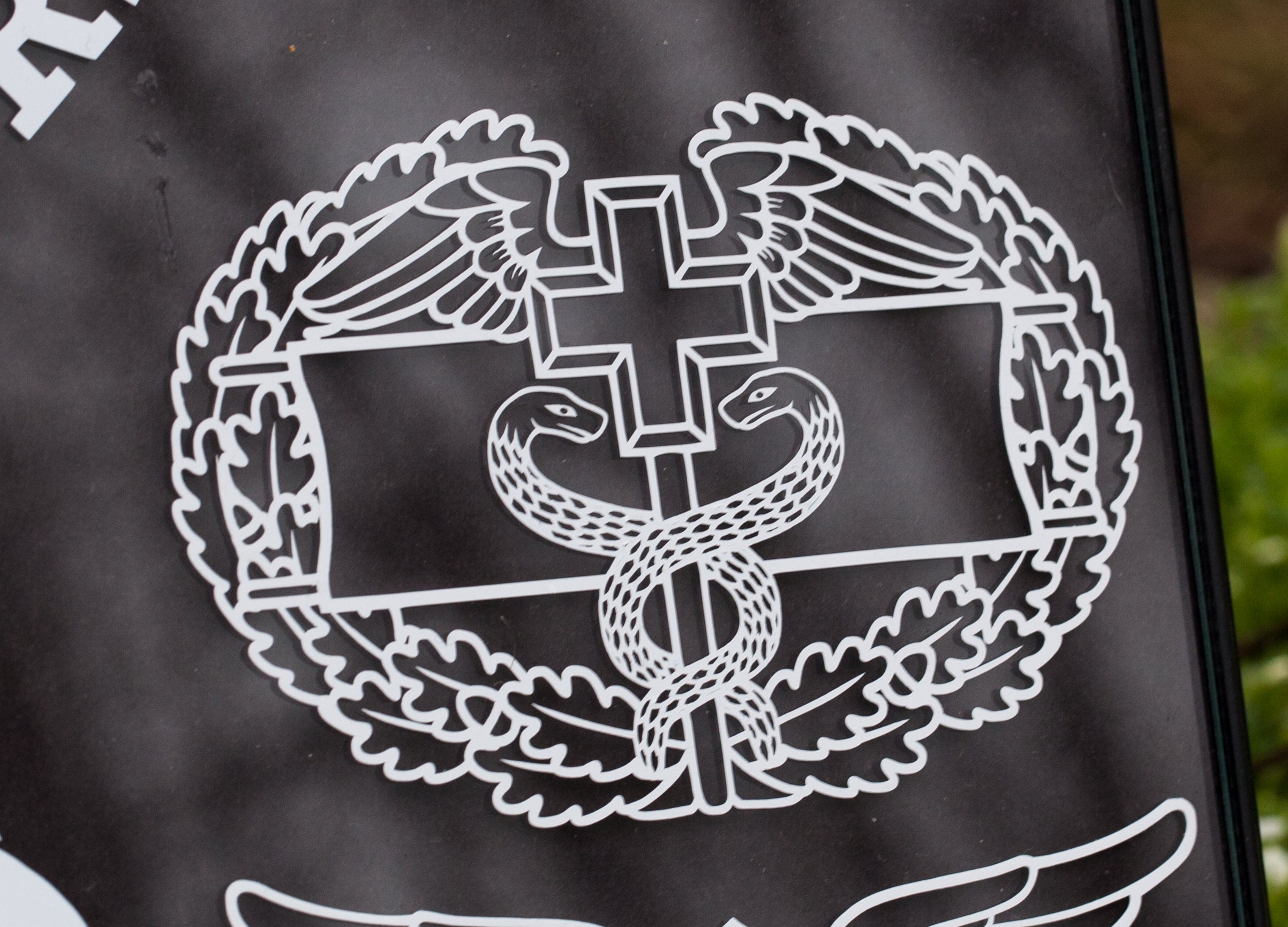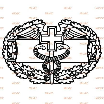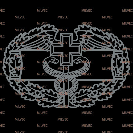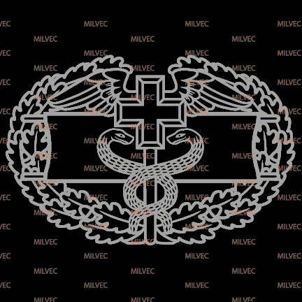 The Combat Field Medical Badge CFMB in cutout vinyl. Intended for vehicle windows but can be used on any smooth surface. Background color simulates a back window, only lighter colors will show well due to inside of vehicle being dark compared to sunlight.