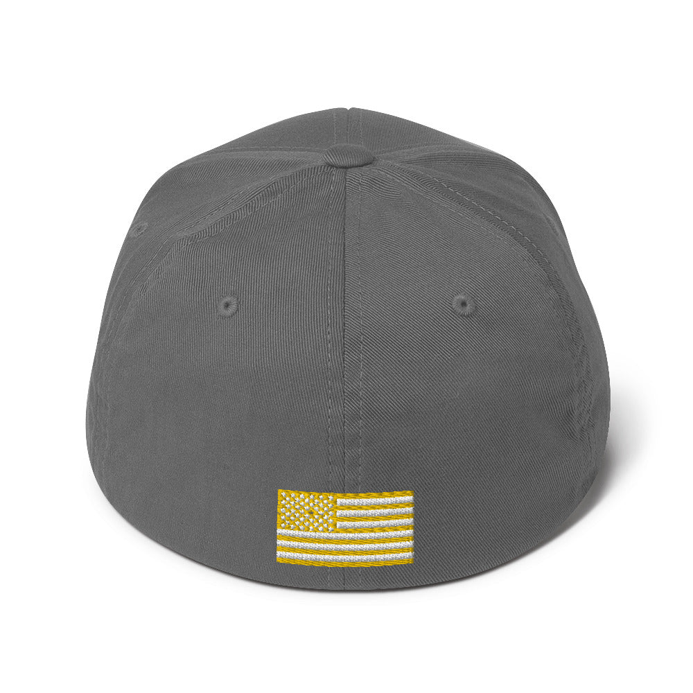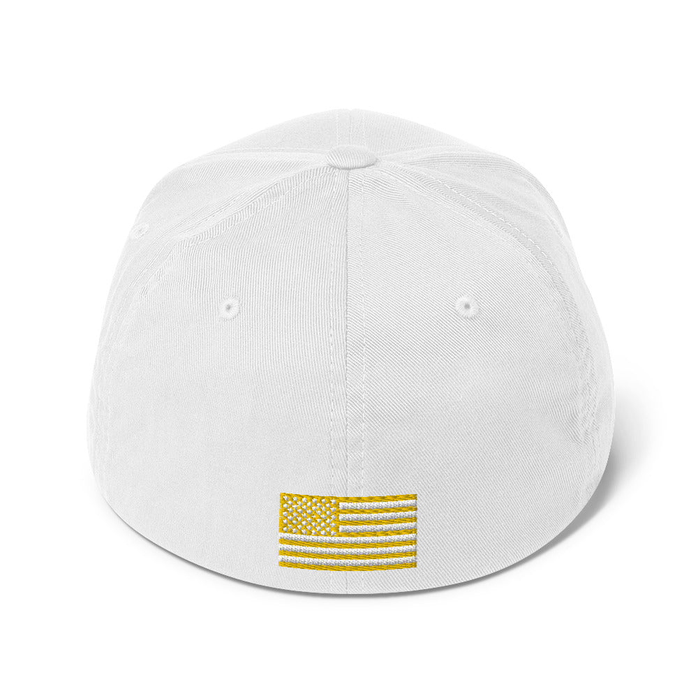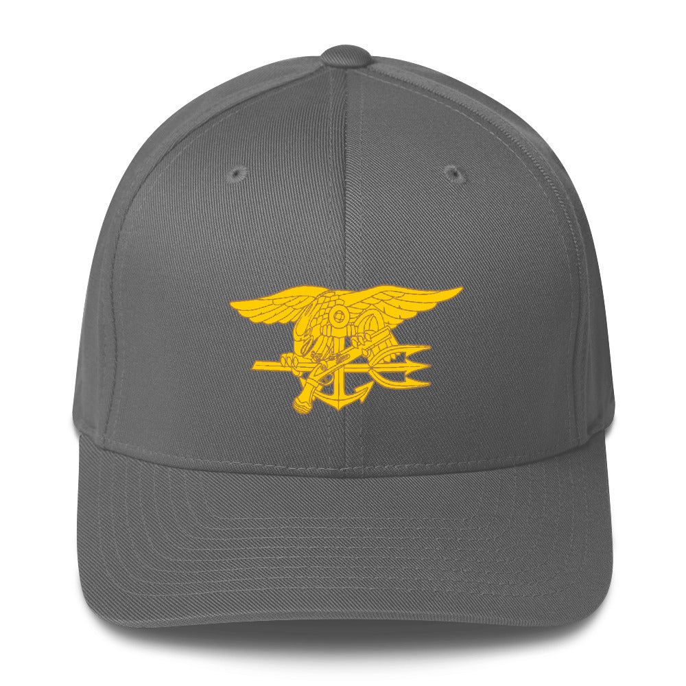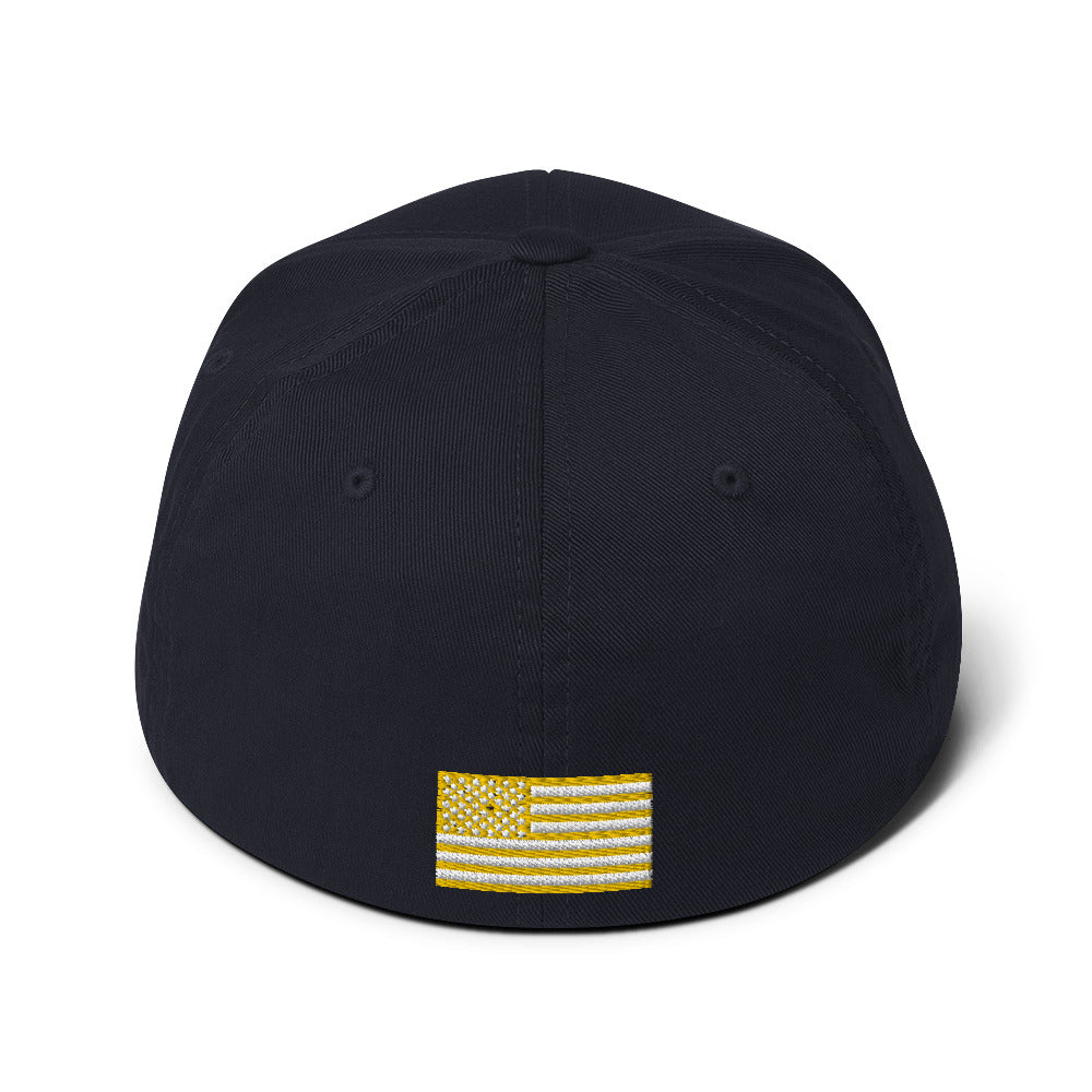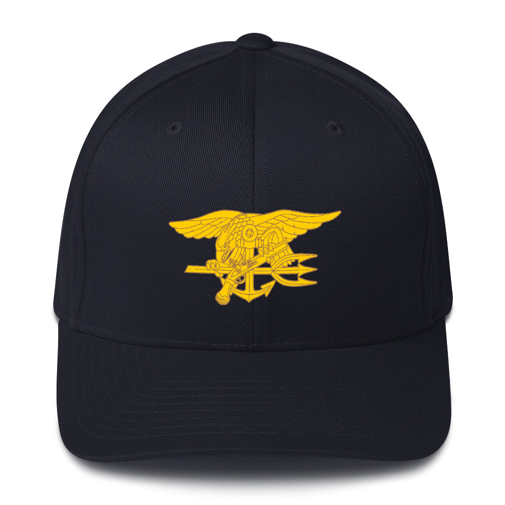 Embroidered Navy SEAL Trident and US Flag on back in gold.