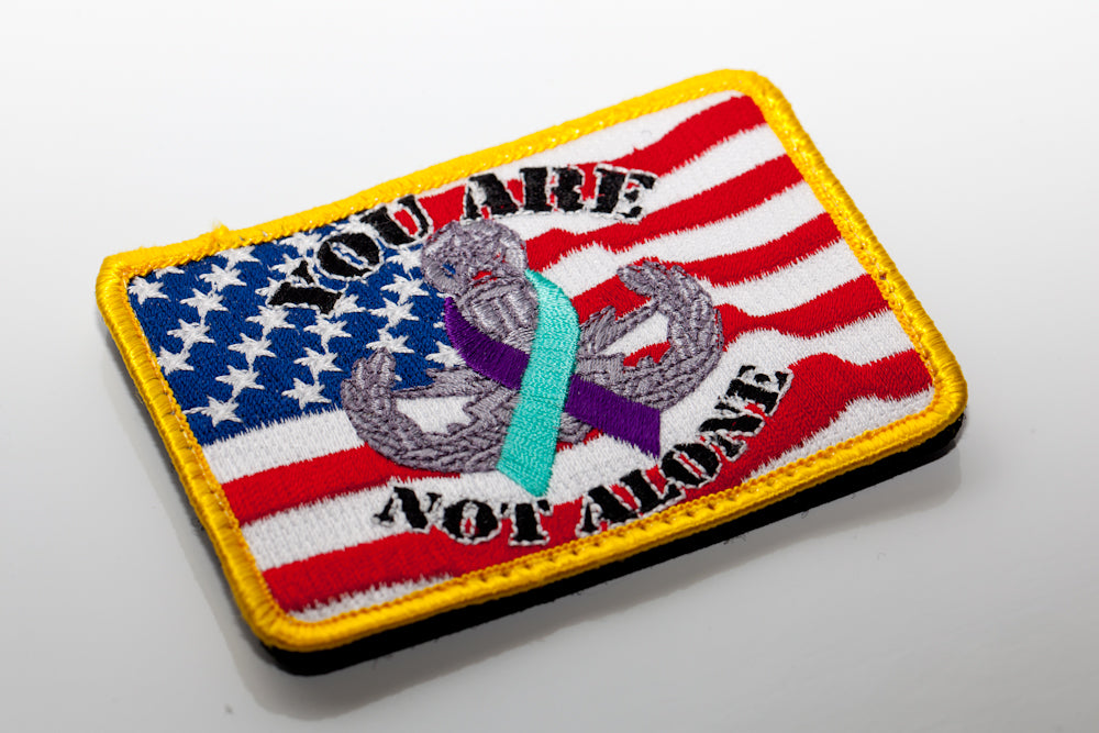 EOD Master with suicide awareness ribbon in front of the US Flag. You are not alone is around.