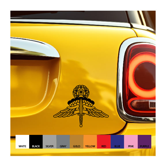 The Freefall HALO Jumpmaster wings in cutout vinyl. Intended for vehicle windows but can be used on any smooth surface. White and lighter colors show better on back vehicle windows.