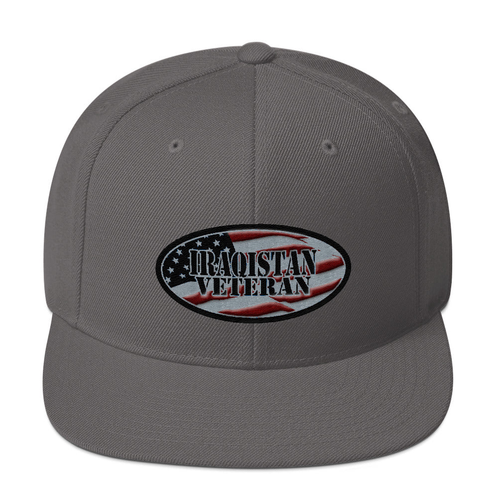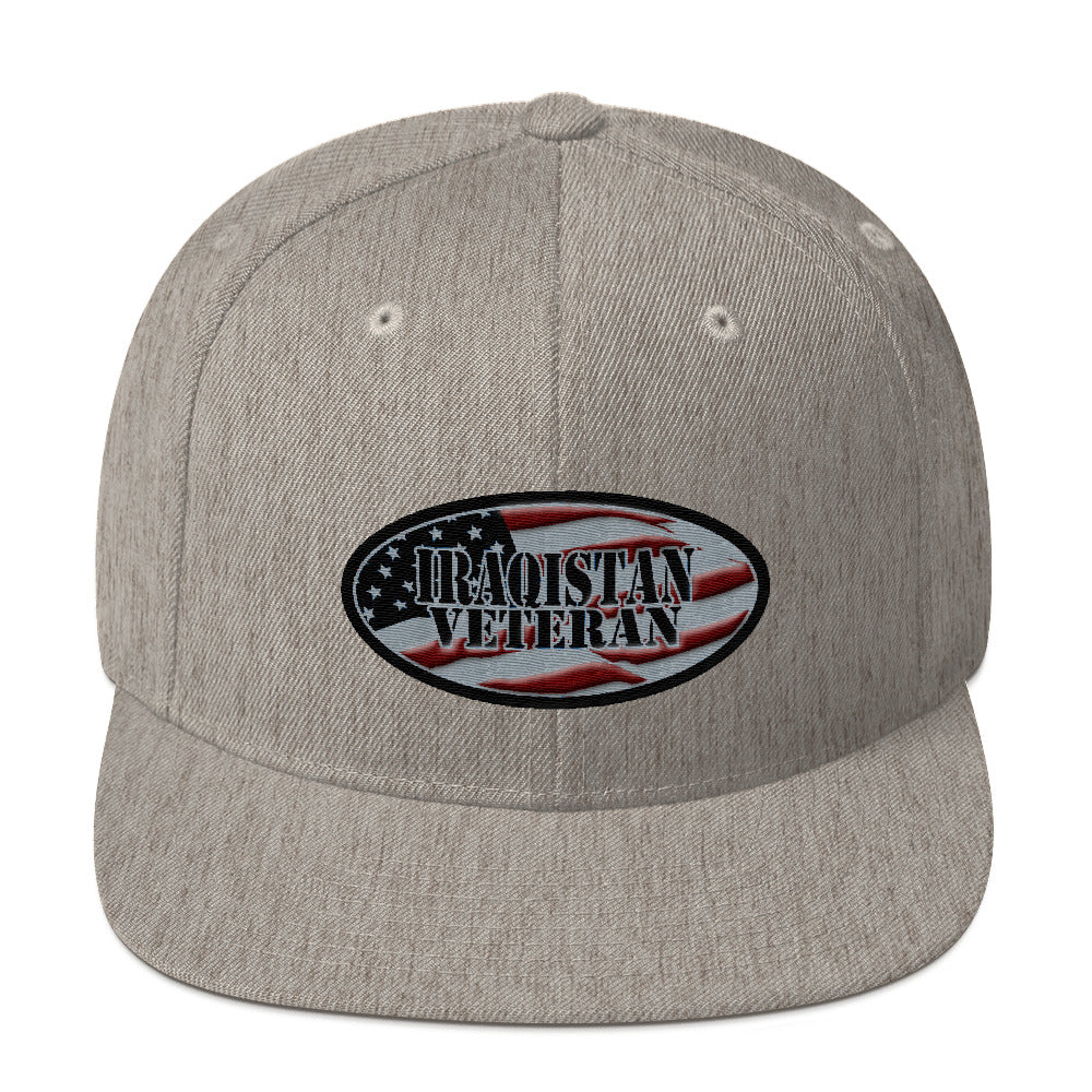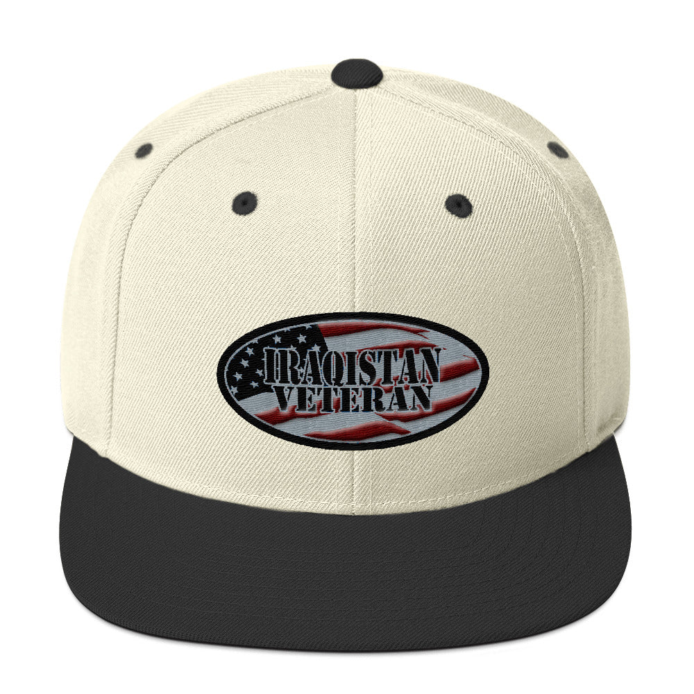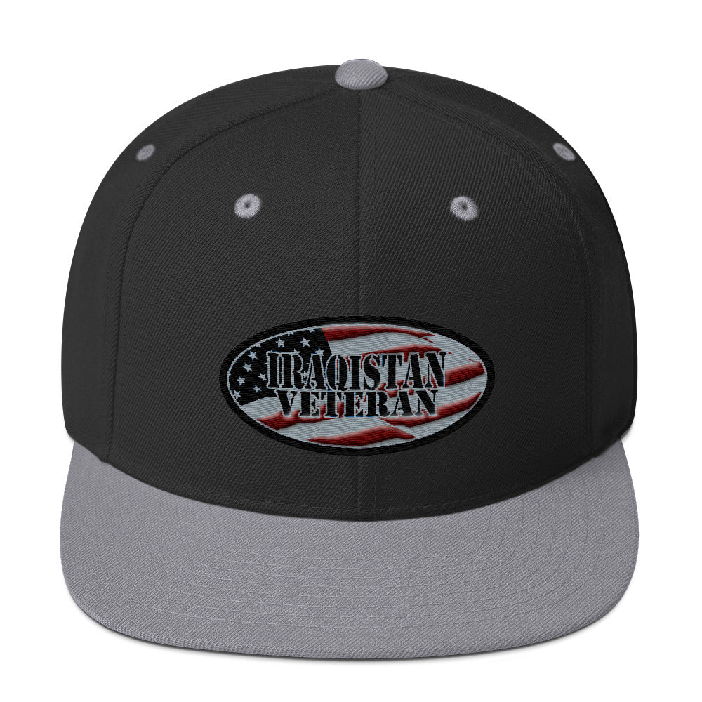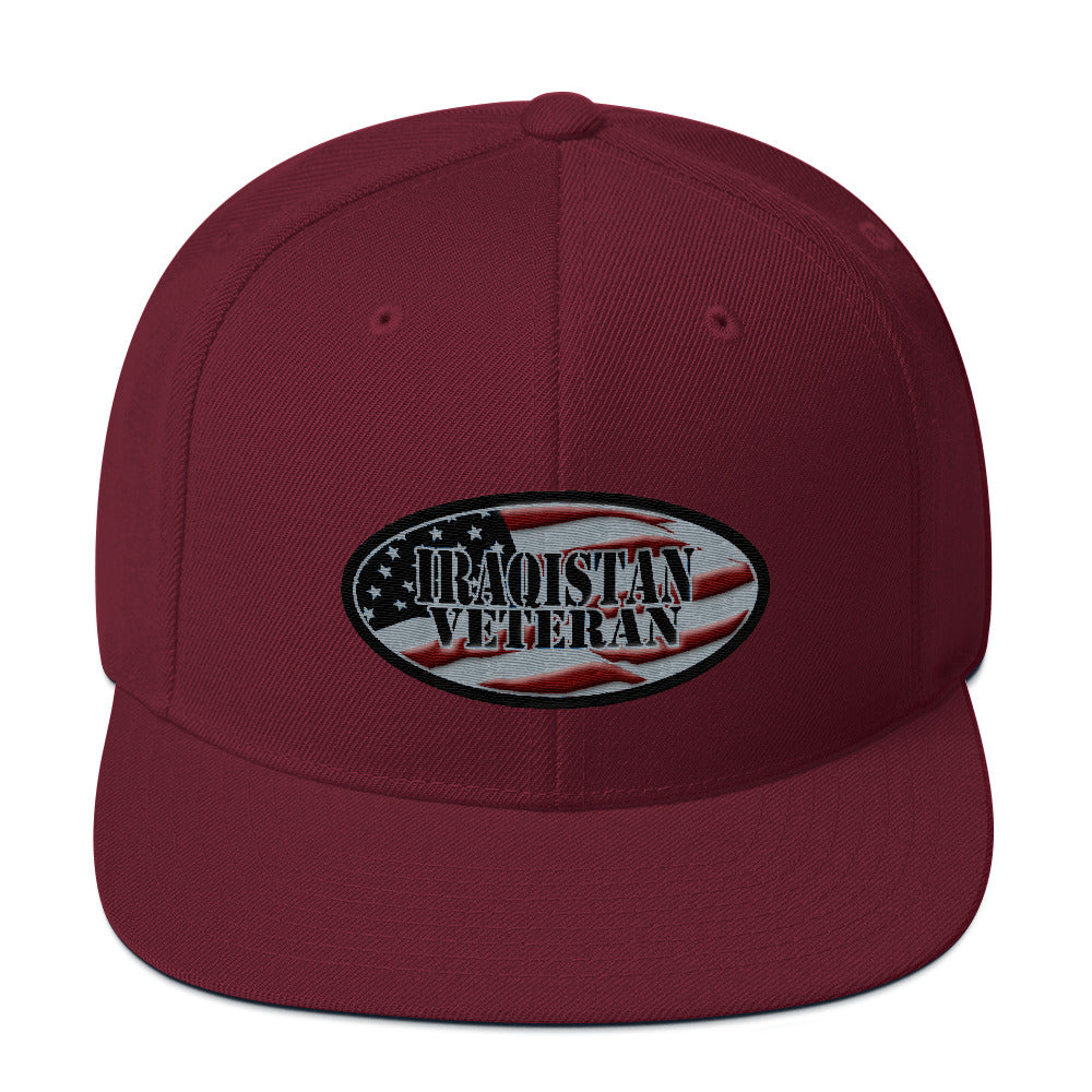Embroidered Iraqistan (Iraq and Afghanistan) Veteran with US Flag behind.