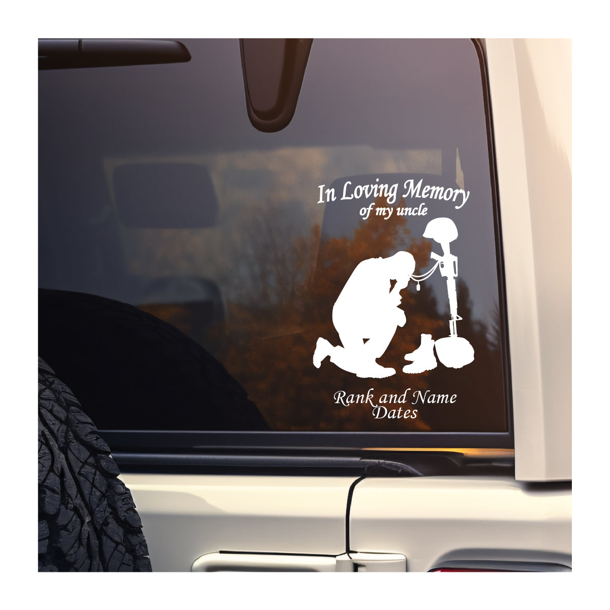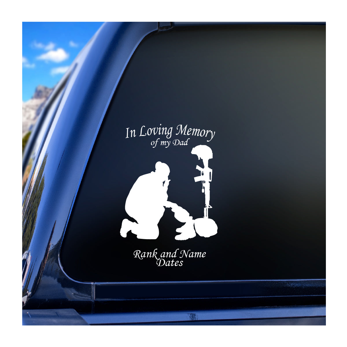 Kneeling at a Battle Cross with text above and below in cutout vinyl. Intended for vehicle windows but can be used on any smooth surface. White and lighter colors show better on back vehicle windows.