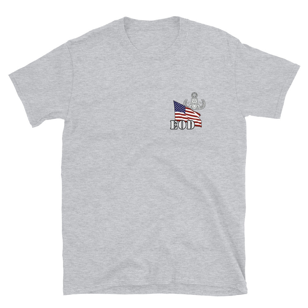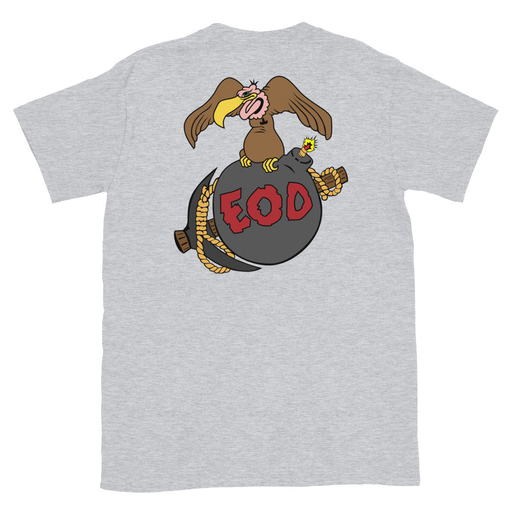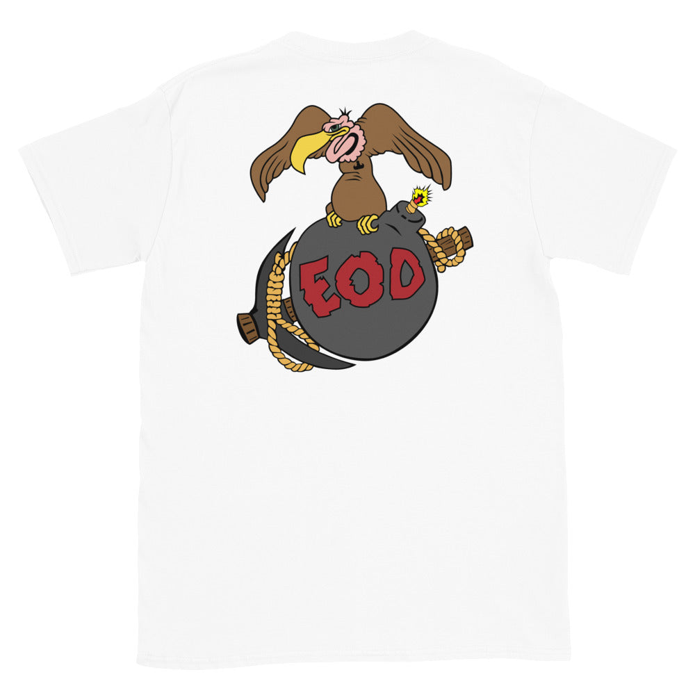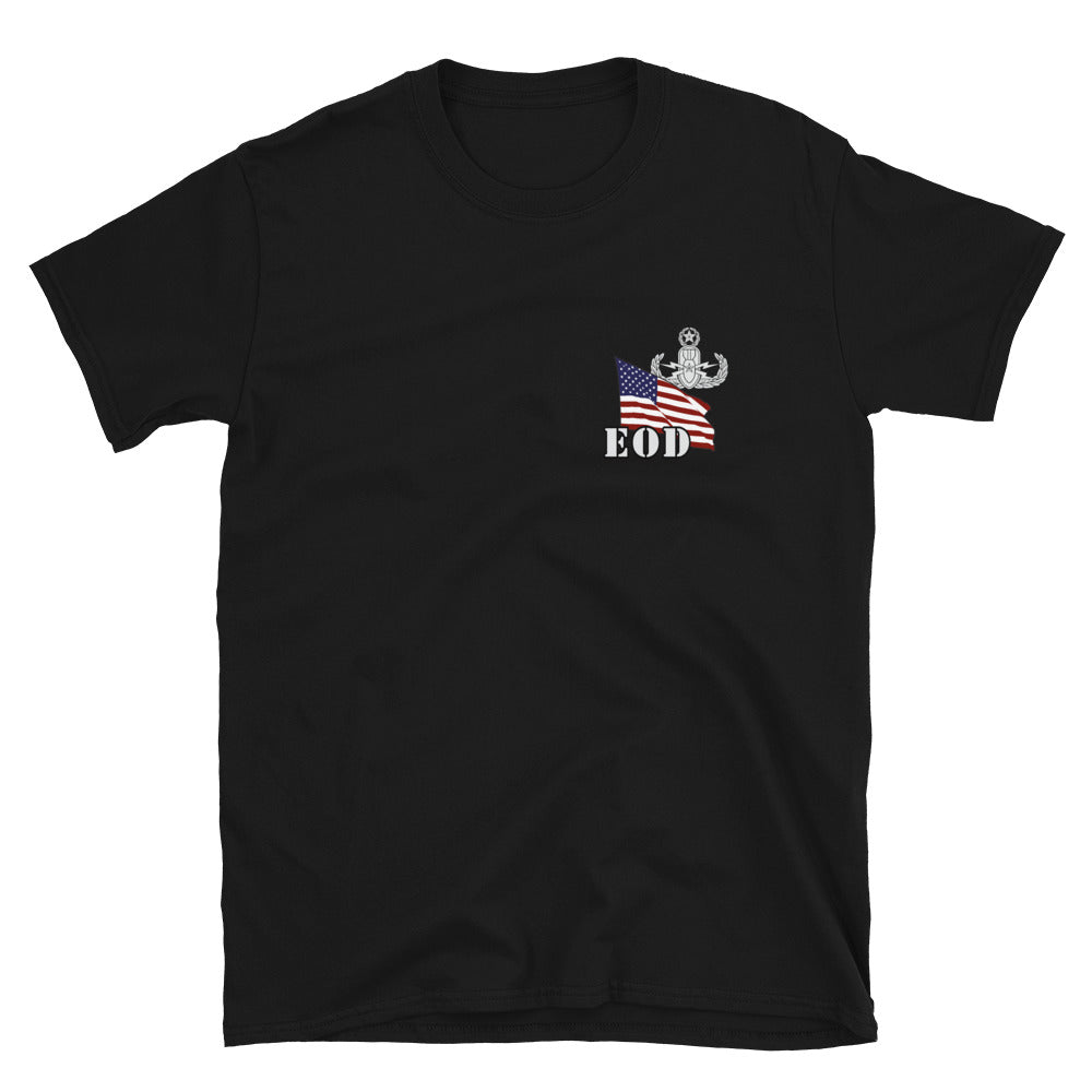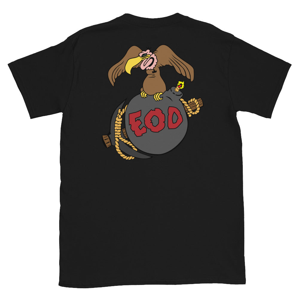 Master EOD badge and US Flag on front pocket area with large Marine Vulture, Cannonball and Pick on back.