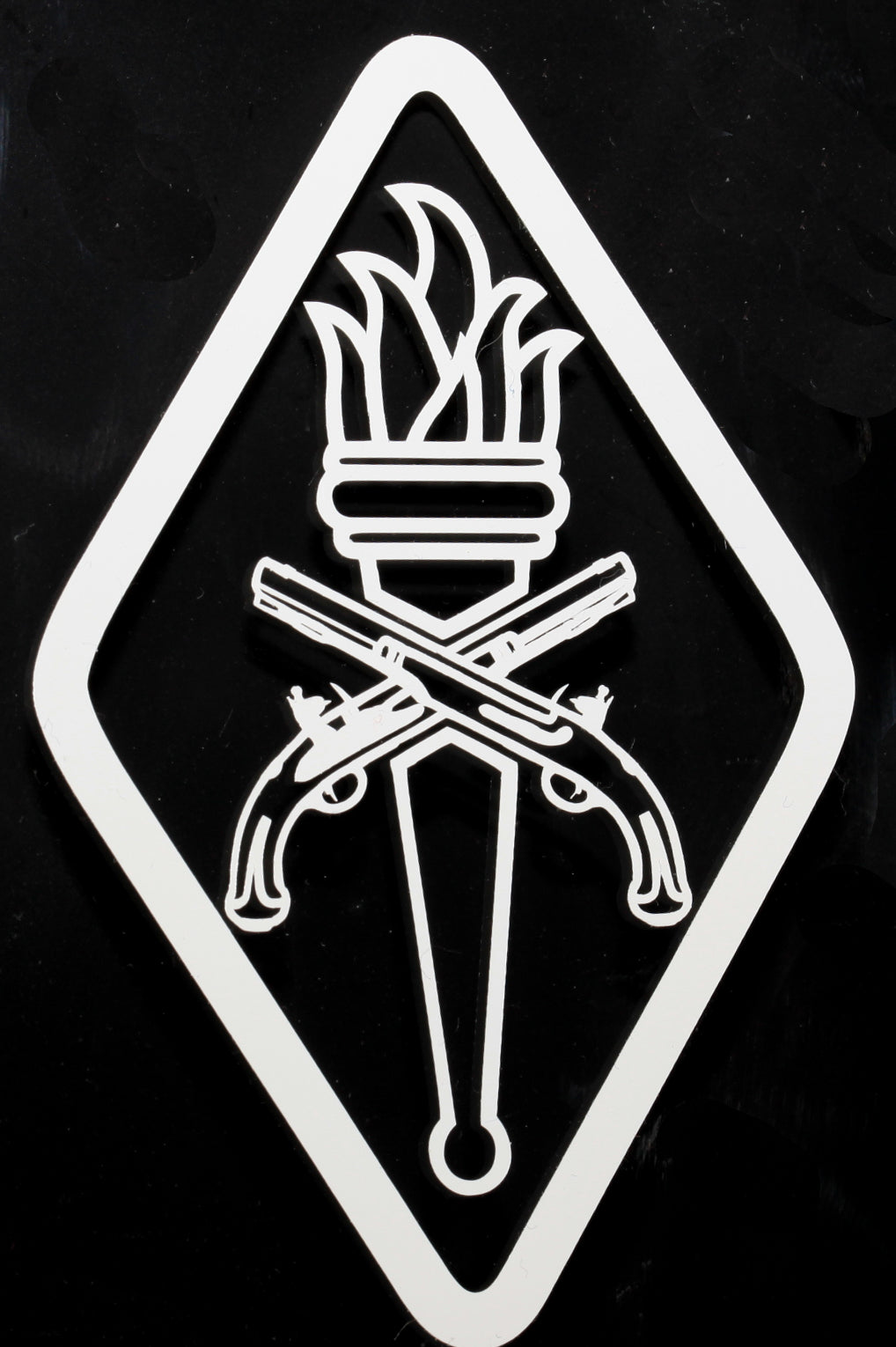 The Military Police School patchin cutout vinyl. Intended for vehicle windows but can be used on any smooth surface. White and lighter colors show better on back vehicle windows.