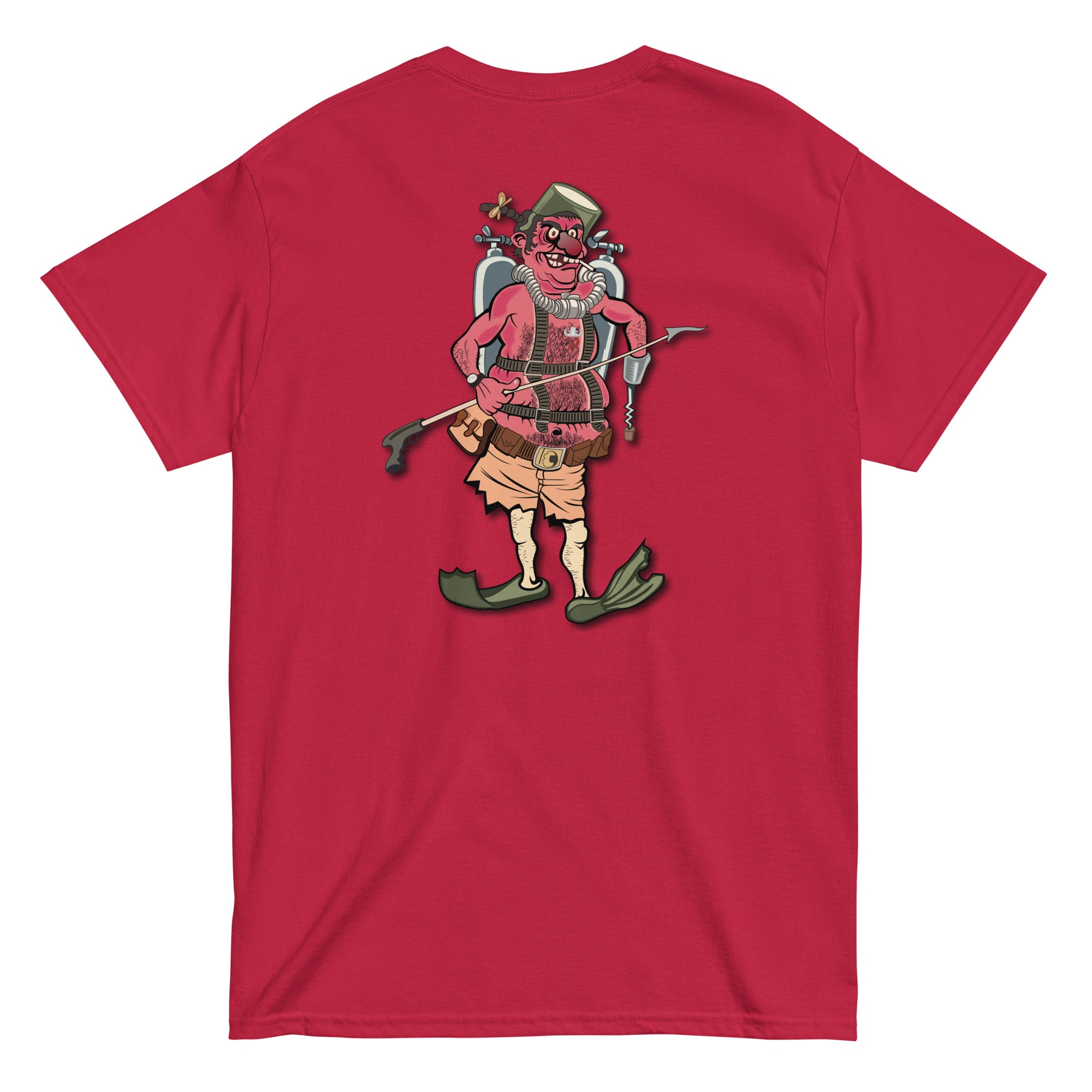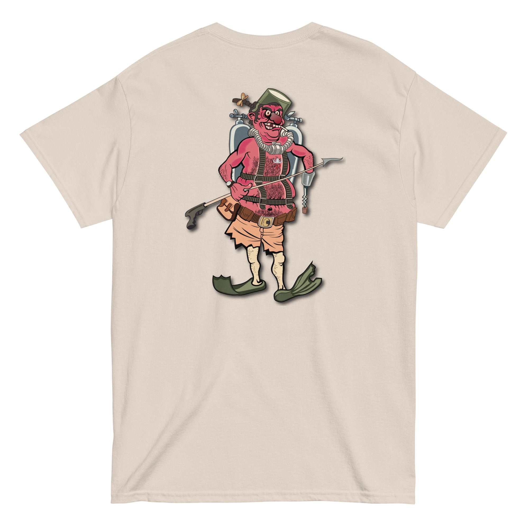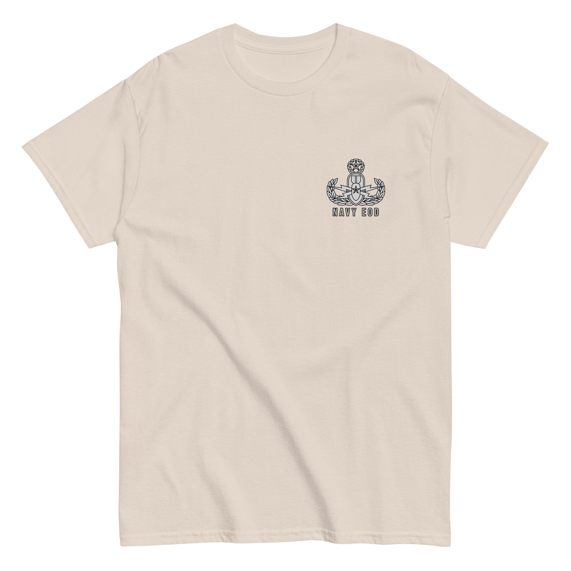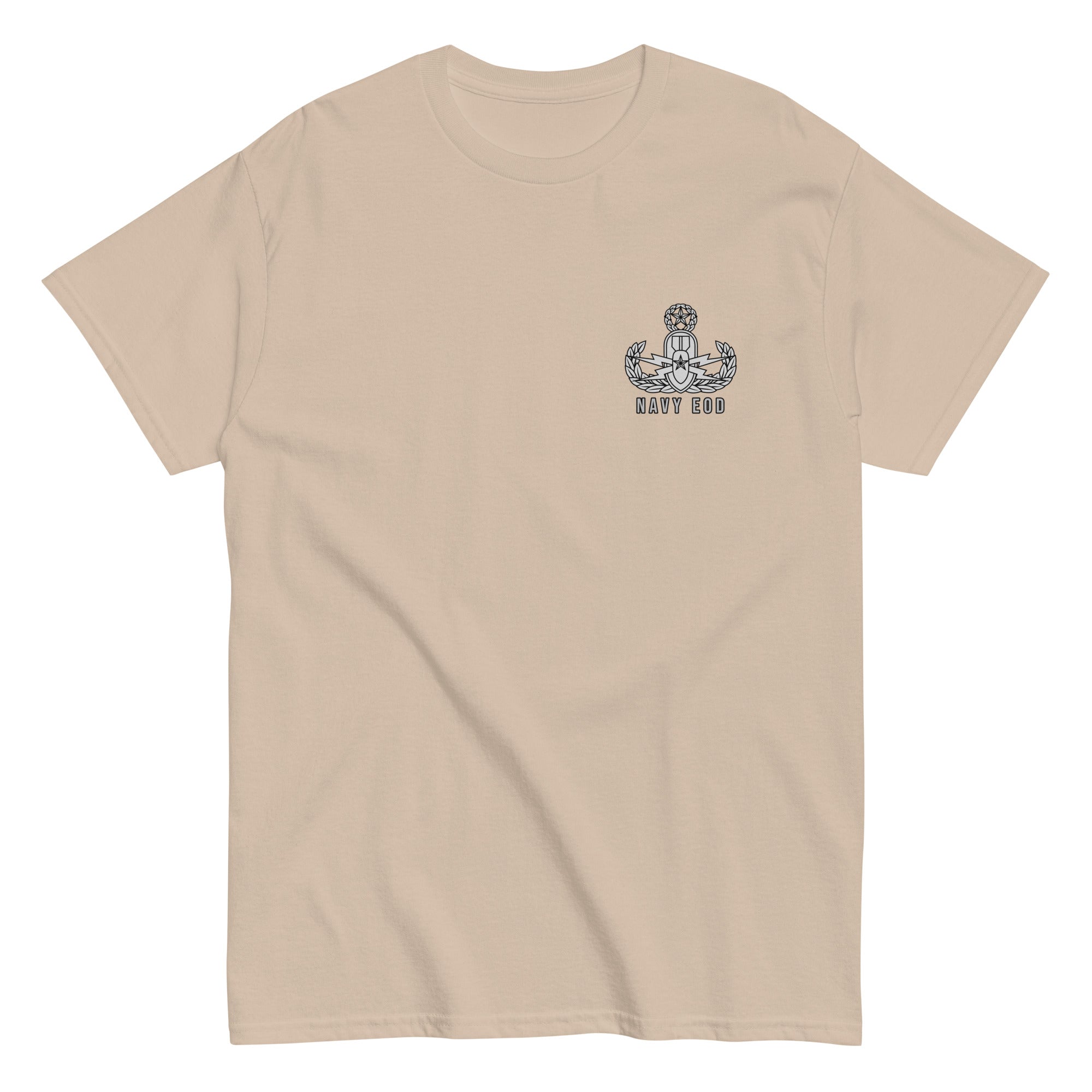 An updated illustration of the classic caricature of a Navy EOD tech on the back and Navy EOD with the master badge on the front.