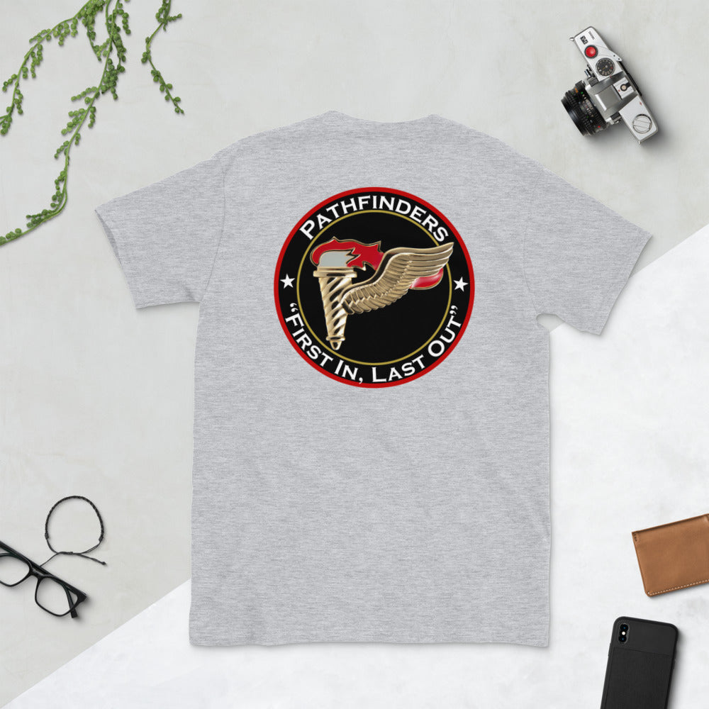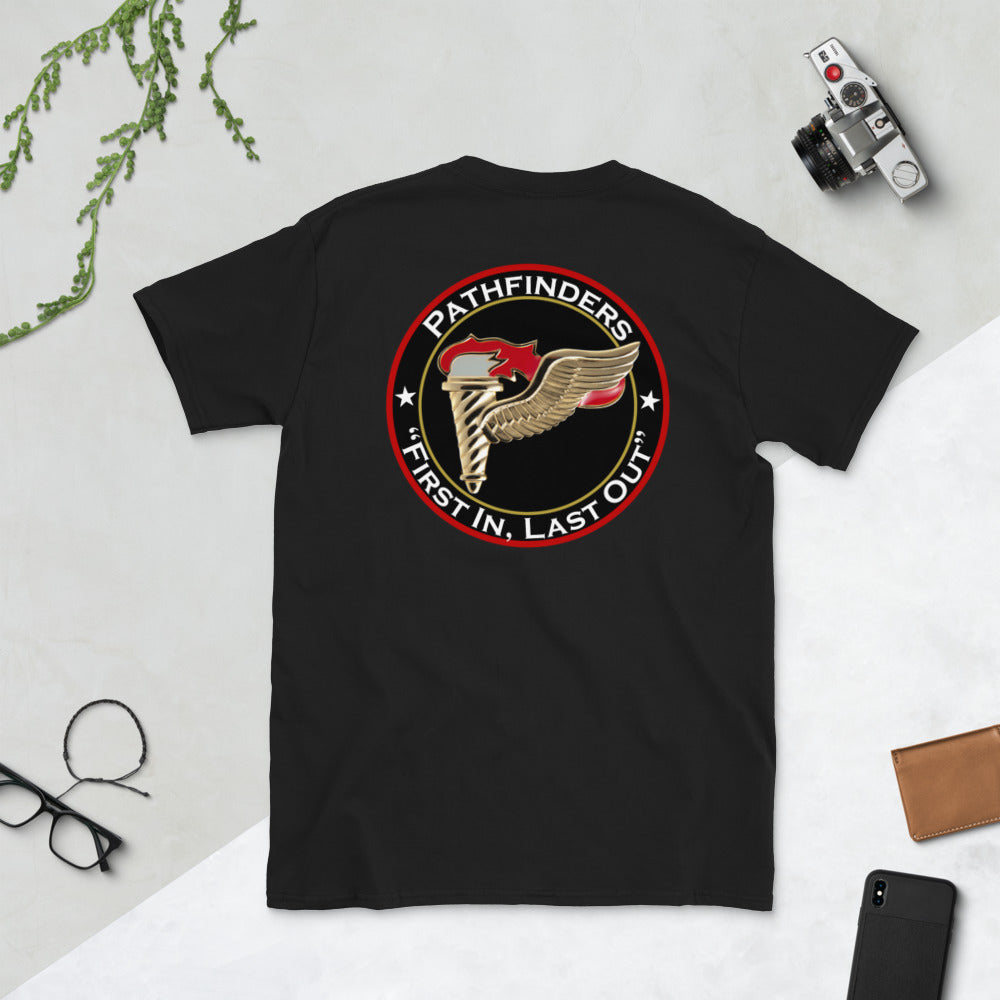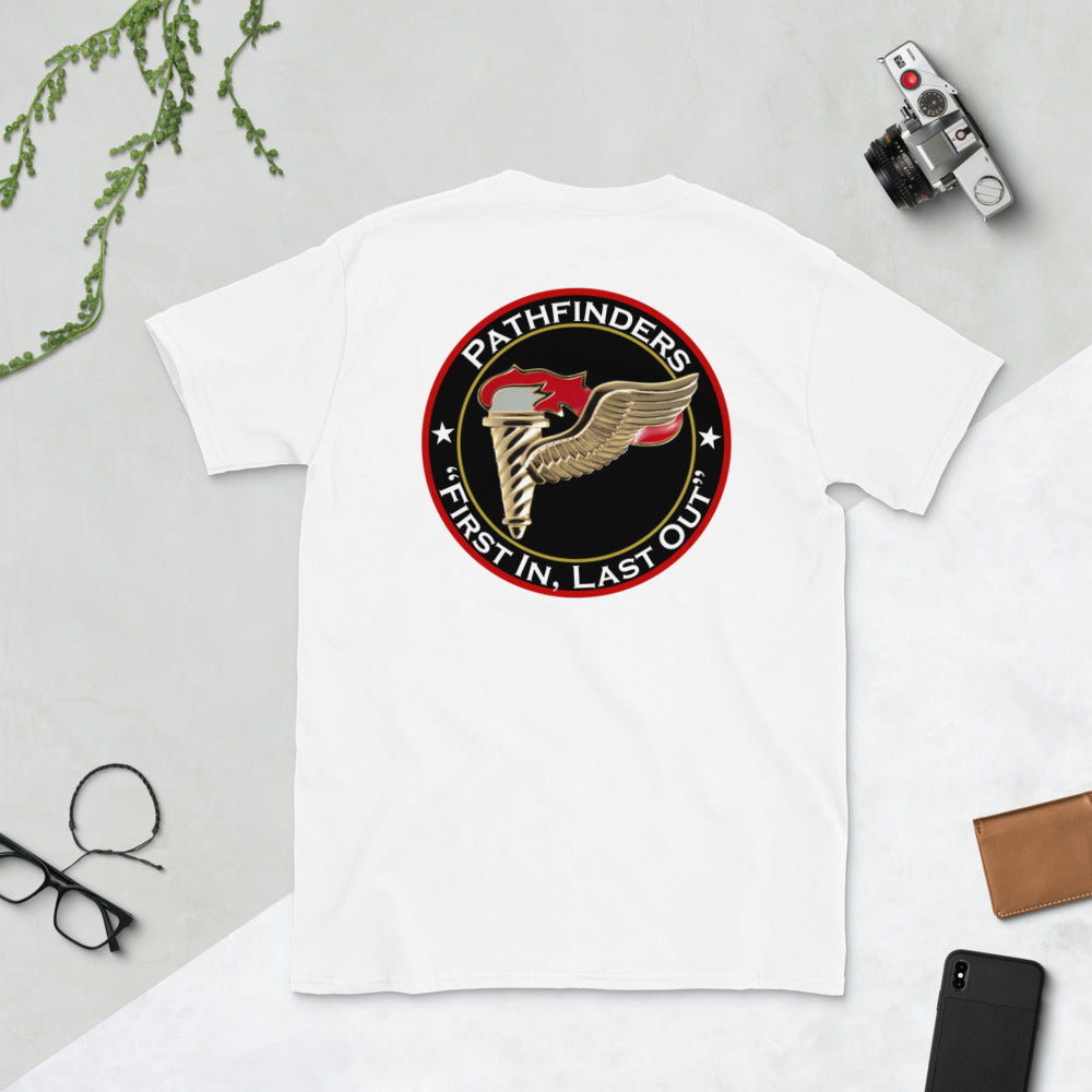 Original photo of the Pathfinder badge with motto "First In, Last Out" on the back.