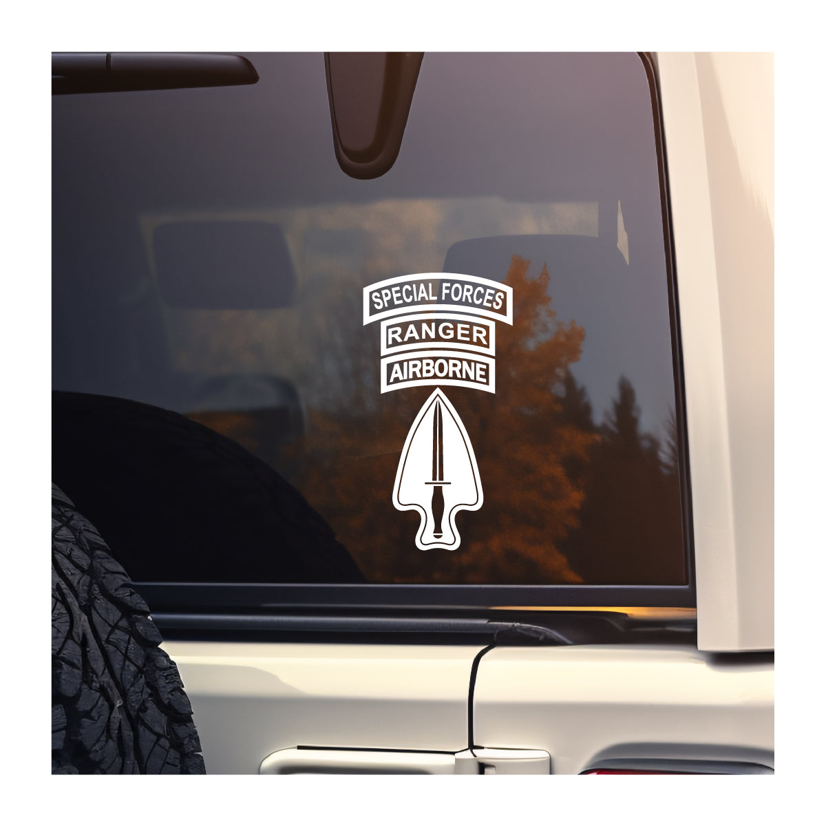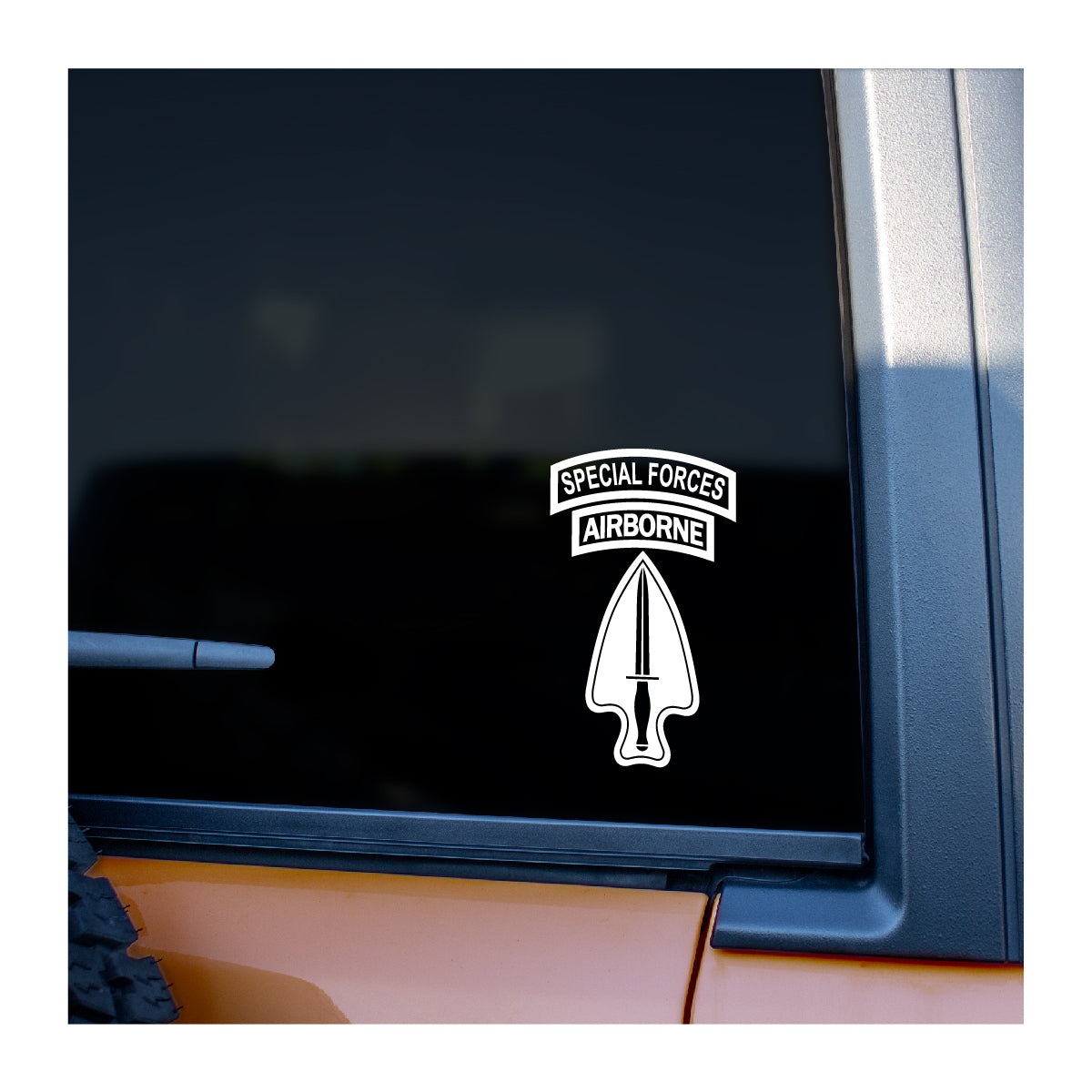 The Special Operations patch with Airborne tab in cutout vinyl. Intended for vehicle windows but can be used on any smooth surface. White and lighter colors will show best due to inside of vehicle being dark compared to sunlight.